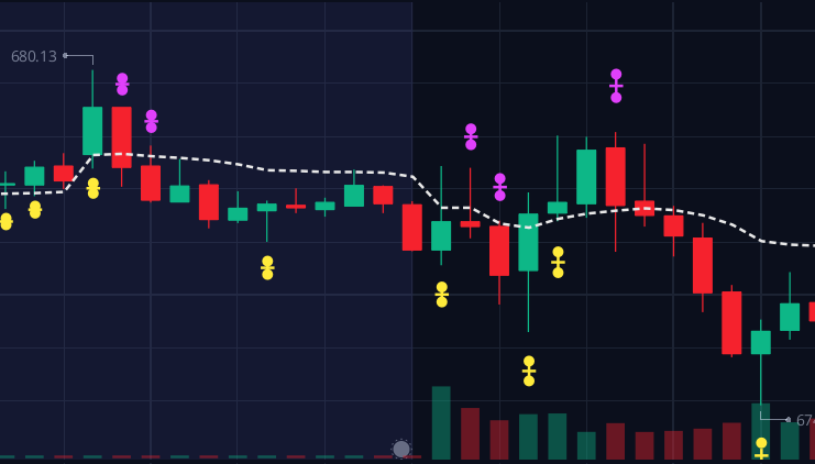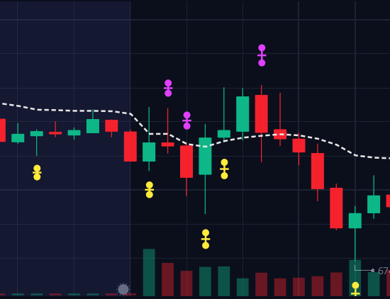 · Two purple circles with a cross in the middle (Bug symbol) - when this prints, it indicates there is high trading volume to the up side - It indicates a Bearish Trend (Uptrend).